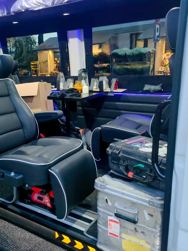 Nasze auto to coś więcej niż zwykły bus. To przestronna, funkcjonalna mobilna baza – pomieści bez problemu cały sprzęt: kamery, statywy, oświetlenie i wszystkie inne niezbędne rzeczy, które trudno byłoby upchnąć w typowym minivanie. Na pokładzie znajduje się również stolik roboczy, przy którym spokojnie można rozłożyć kamerę, naładować baterie czy zorganizować sprzęt przed zdjęciami.